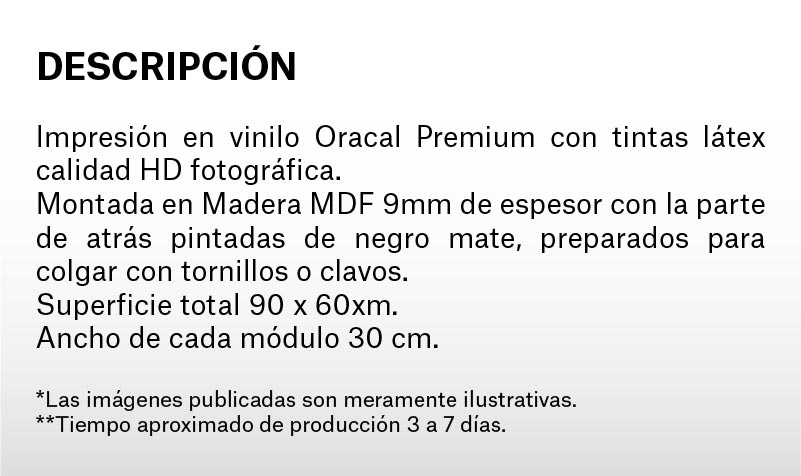 • Impresión vinilo oracal premium montada en madera MDF 9mm de espesor, cada módulo 30 cm ancho.